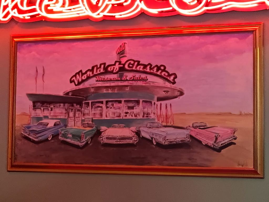 Etter omvisningen gikk turen opp i 3.etg - der ventet det en utrolig opplevelse av å føle at man hadde havnet tilbake til 50-tallet. Her var det Amercian Diner stil, overalt ! Man må nesten ha flere dager, skal man klare å få med seg alt som er hos Tony & gjengen. Her oppe kunne man finne "prylar" å kjøpe. Det var gensere, jakker, T-skjorter, ja, nesten alt man kunne tenke seg. Og fant man et skilt man hadde lyst på, og det ikke var å finne noe annet sted enn på veggen. Ja, da skrudde de ned skiltet, og hengte bare opp et annet. På den måten var det noen av oss som kunne få skiltet av sin egen bil med hjem. Det er et Amerikansk bilmiljø fordelt på ca 3.000 kvm areal.